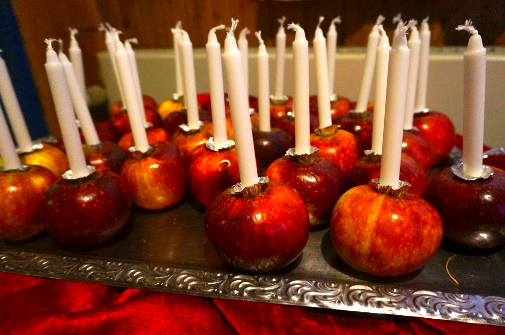 Vi behøver meget gran til at lægge spiralen. Vi køber røde æbler, som vi dagen inden festen, sammen med børnene, pudser med pudseklude, til de skinner flot. De voksne sætter et lille lys i hvert æble. Vi får hvert år besøg af en ”troubadur” - en far til et barn, der for flere år siden gik i børnehaven – som spiller smuk musik på sin guitar, måske i år sammen med Thomas, Elias´ far, som spiller cello. Vi synger julens sange og sange om årstiden. Alle sange til denne fest er rolige, næsten meditative. Der bliver pyntet op til festdagen.